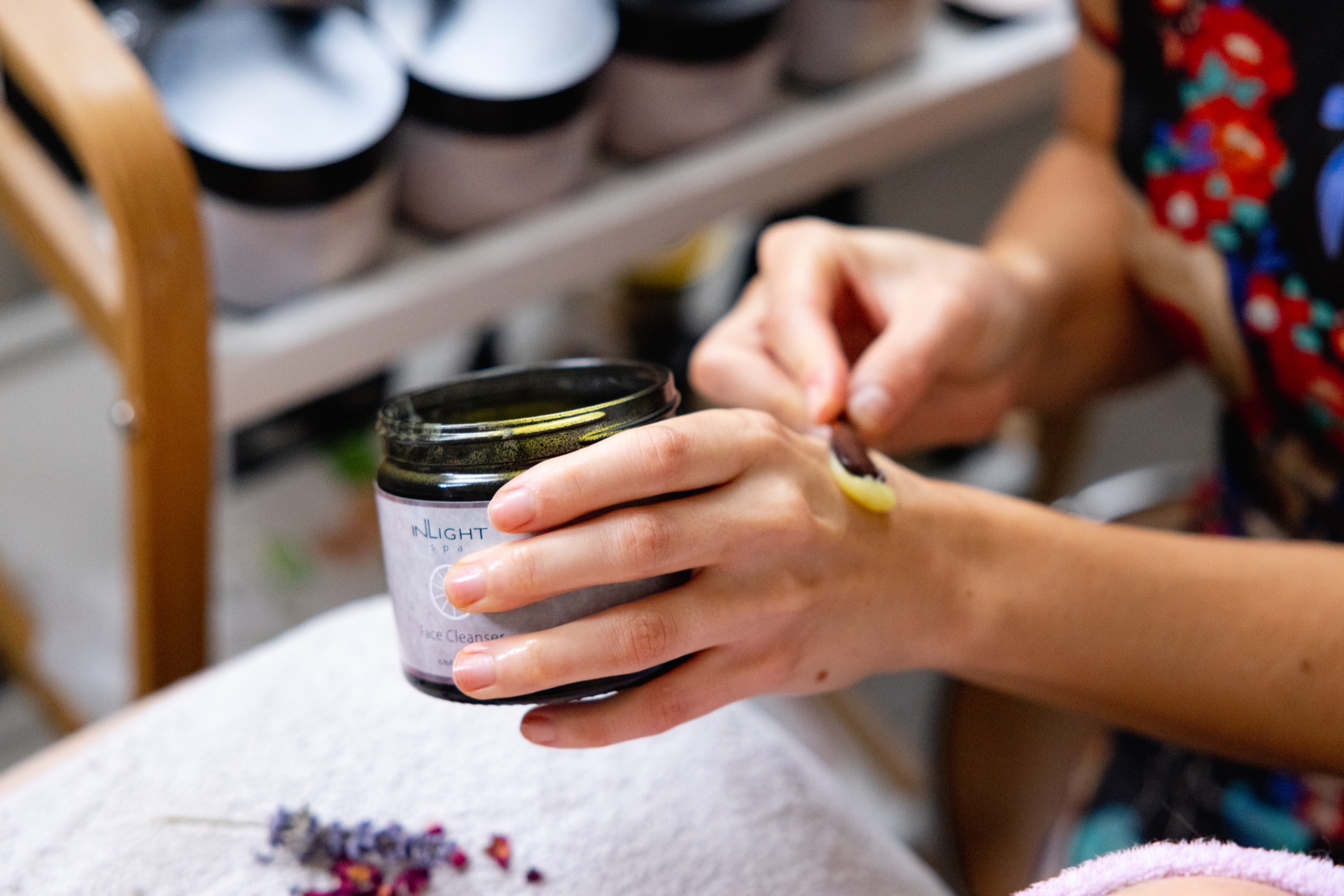 - Působení blahodárné aromaterapeutické kompozice bylinných balzámů značky INlight, masáž hlavy při působení pleťové masky